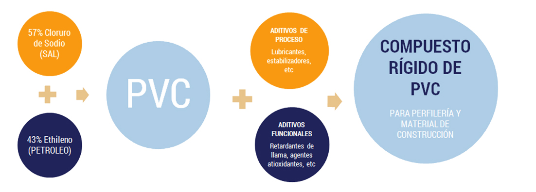 Pero el PVC no puede utilizarse tal como se obtiene de su proceso productivo porque no reúne por sí sólo las propiedades necesarias y por ello se elaboran compuestos cuya base es el PVC. entonces se le agregan aditivos de proceso y aditivos funcionales como lubricantes. retardantes de llama. estabilizadores. etc. Que darán como resultado el compuesto rígido de PVC utilizado en la fabricación de perfilería y materiales de construcción.